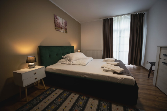 La pensione Bukov si trova all'ingresso di Voronet. Raggiungerci è facile, è più difficile per te andartene. Attraversa il ponte sul fiume Moldova e fai la prima strada a destra. Qui, sulle rive della Moldova, c'è una strada solo con le pensioni. Hai a tua disposizione un ampio giardino interno con alberi e prato, un enorme padiglione e un barbecue con fumatore, piano cottura e forno. Abbiamo anche messo molte lampadine in giardino per mantenere un'atmosfera allegra. Entrando nella pensione dal portico, si trova un soggiorno di 70 mq con divani verdi e tavoli da ristorante. Serviamo solo cibo su richiesta, ma la cucina è completamente attrezzata e sappiamo che ti piace cucinare. Sorprendiamo gli amanti della musica con un sistema audio Bose all'interno e altoparlanti in stile lounge all'esterno. Le stanze sono grandi e pulite. I nostri clienti ci hanno detto che puoi davvero riposare sui nostri materassi, ma ovviamente anche il rumore del fiume Moldova ha voce in capitolo.