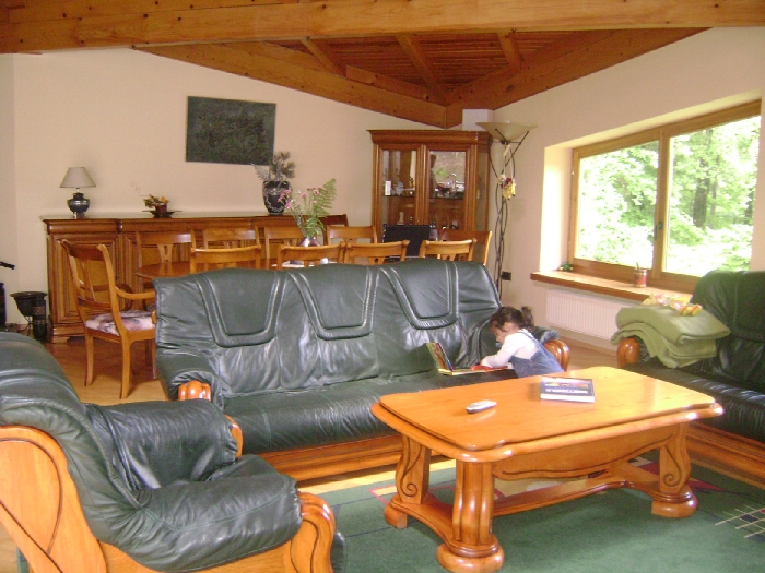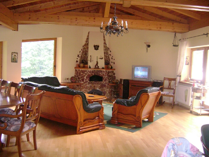Vila deosebita, complet utiliata si dotata, cu priveliste superba, pe partea nordica, spre Crucea de pe Caraiman, inconjurata de padure, structurata pe 3 niveluri. Un palier de aprox. 100 mp- open space- living cu semineu, bucatarie dotata inclusiv cu masina de spalat vase, camera centralei si WC servici; un palier cu 3 dormitoare cu paturi matrimoniale- unul cu baie proprie si doua deservite de aceeasi baie; un palier de aprox 50 mp cu 2-4 locuri de dormit, baie proprie si bucatarie.