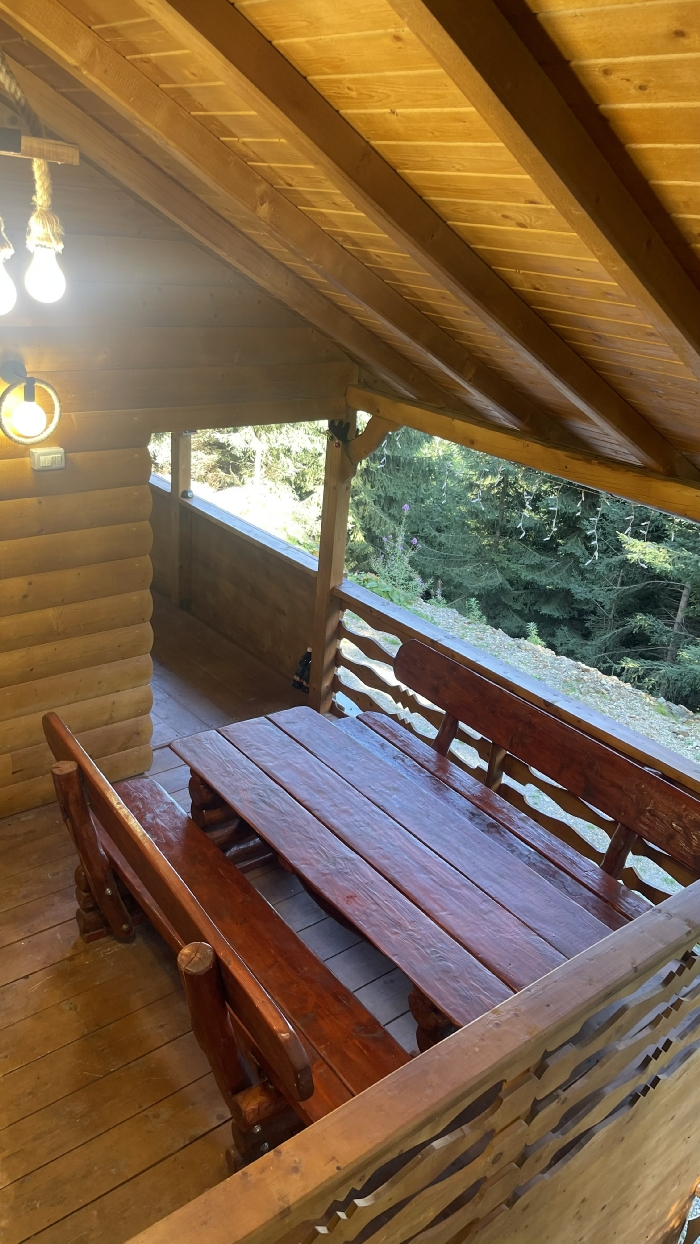 Nivelul 1: Bucatarie cu plita electrica si soba (dispune de 1 canapea extensibila), Living (dispune de 1 canapea extensibila) cu scari spre Nivelul 2, terasa in spatele cabanei cu ciubar, gratar + ceaun in spatele cabanei)